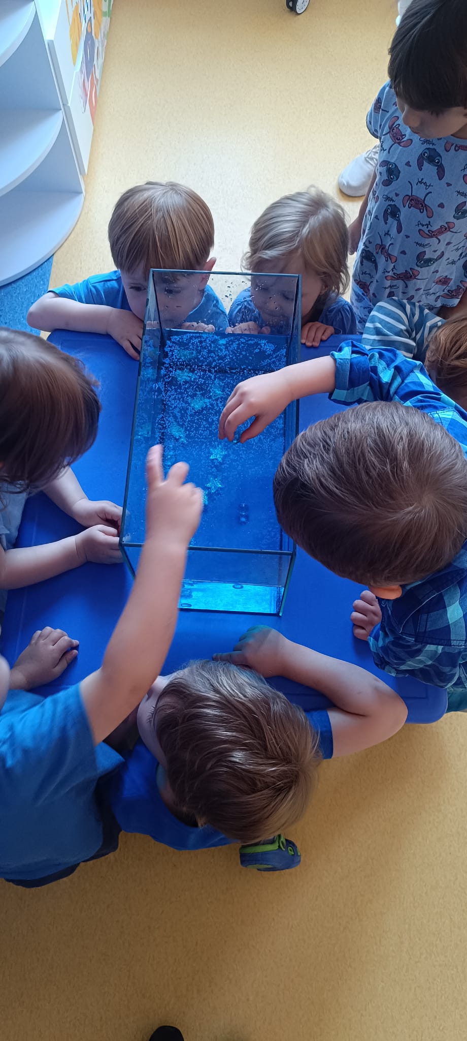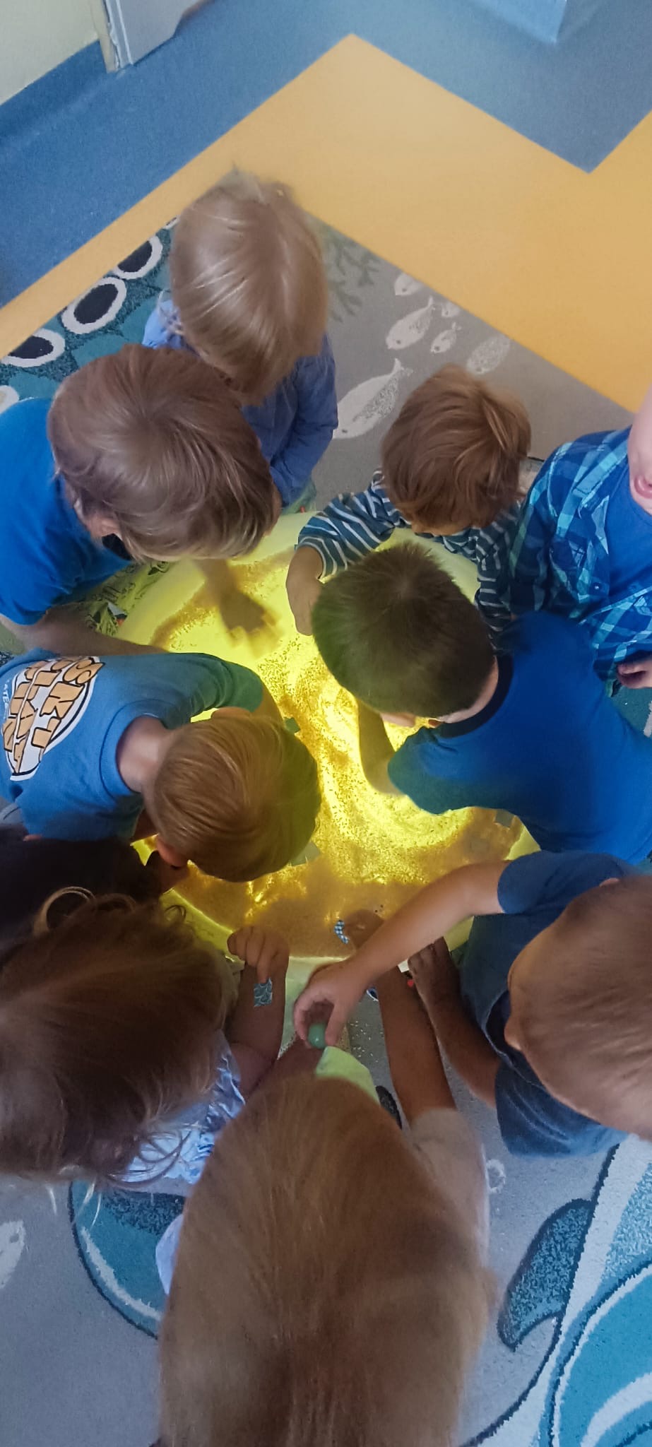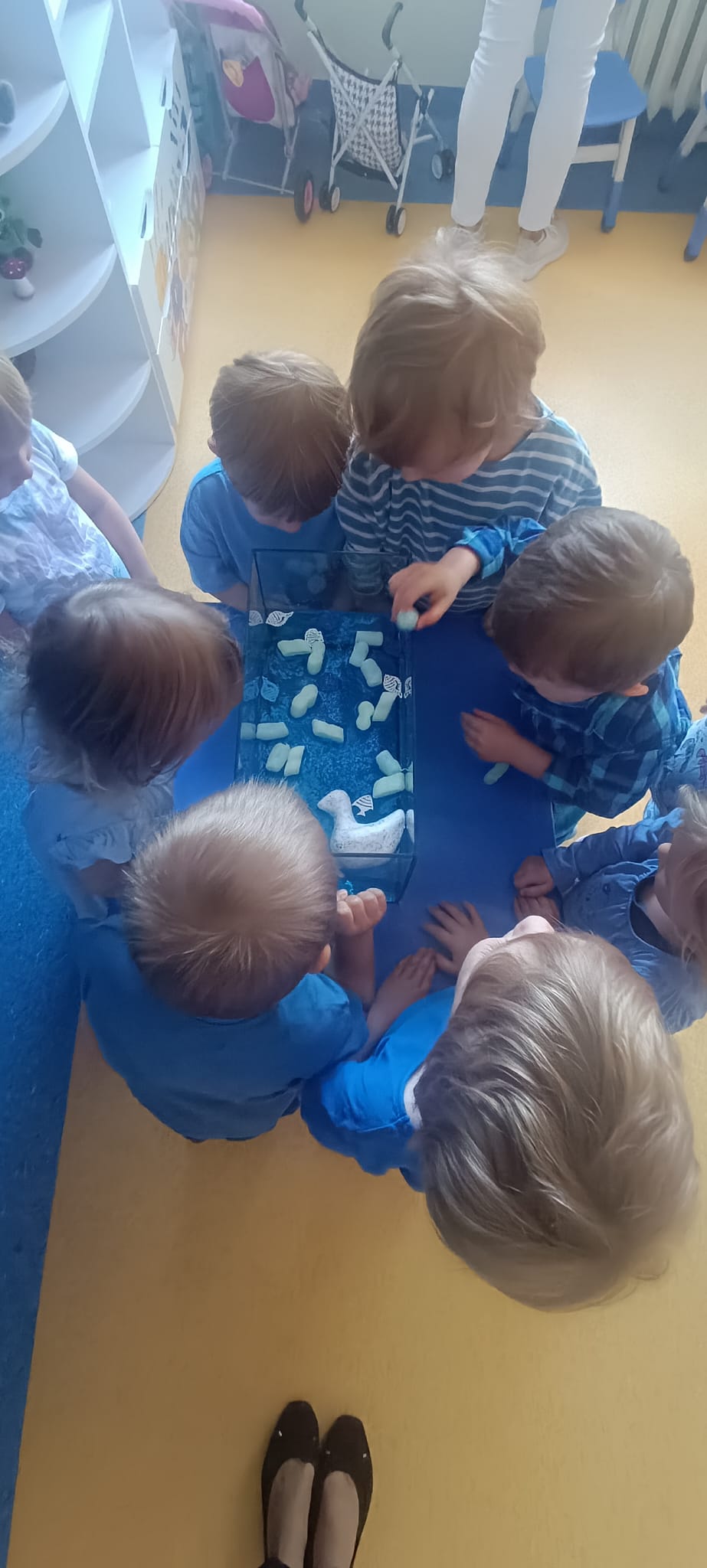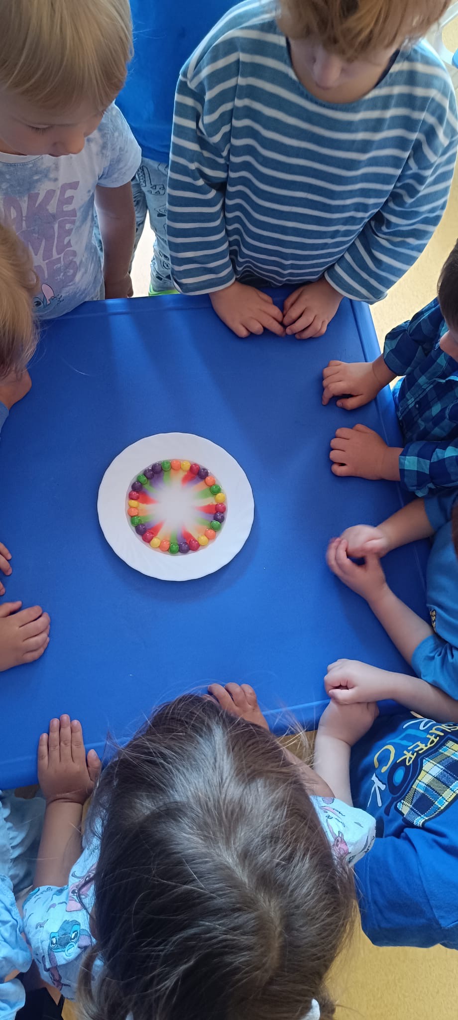 Z okazji Dnia Przedszkolaka obchodziliśmy Dzień Kolorów. Naszym kolorem przewodnim był niebieski. Wszyscy tego dnia przybyliśmy do przedszkola ubrani w różne odcienie niebieskiego. Eksperymentowaliśmy z wodą, barwnikami, nazywaliśmy kolory, sprawdzaliśmy co pływa a co tonie, barwiliśmy mleko kredą. Na stoliku sensorycznym tworzyliśmy kolorową makietę z wykorzystaniem kolorowych kulek i ryżu. W ogrodzie przedszkolnym mogliśmy łapać bańki i tańczyć przy dźwiękach muzyki. Do domu każdy mogł zabrać balonową opaskę z motywem innego zwierzątka.